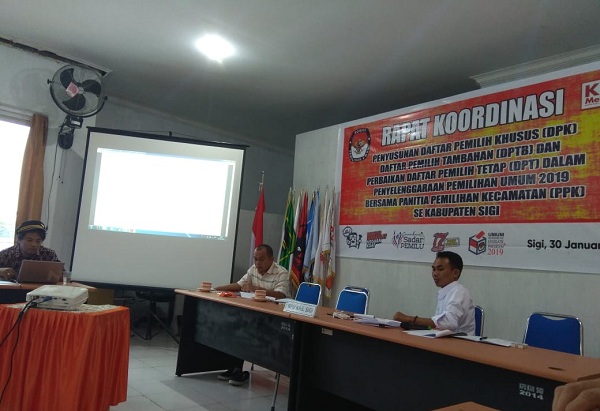PALU EKSPRES, SIGI- KPUD Sigi Bersama Dinas Kependudukan dan Catatan Sipil (Dukcapil) Sigi, Bawaslu Sigi dan seluruh Panitia Pemilihan Kecamatan (PPK) se- Kecamatan Kabupaten Sigi melaksanakan rapat koordinasi (Rakor) tentang penyusunan Daftar Pemilih Khusus (DPK), Daftar Pemilih Tambahan (DPTB) dan perbaikan Daftar Pemilih Tetap (DPT), Rabu 30 Januari 2019