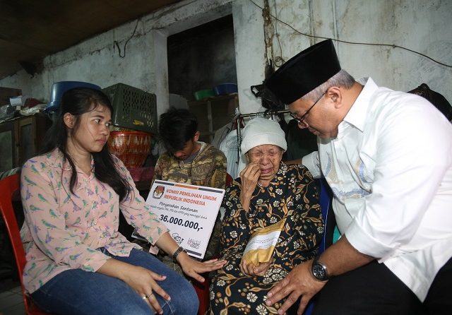 Ketua KPU Arief Budiman (kanan) ketika menyerahkan santunan kepada keluarga almarhum Tutung Suryadi, petugas KPPS yang wafat, di Tangki, Tamansari, Jakarta Barat, Jumat (3/5/2019). Santunan sebesar Rp 36 juta itu merupakan wujud duka cita sekaligus apresiasi atas kinerja petugas KPPS yang gugur saat bertugas dalam Pemilu 2019. Foto: MIFTAHULHAYAT/JAWA POS