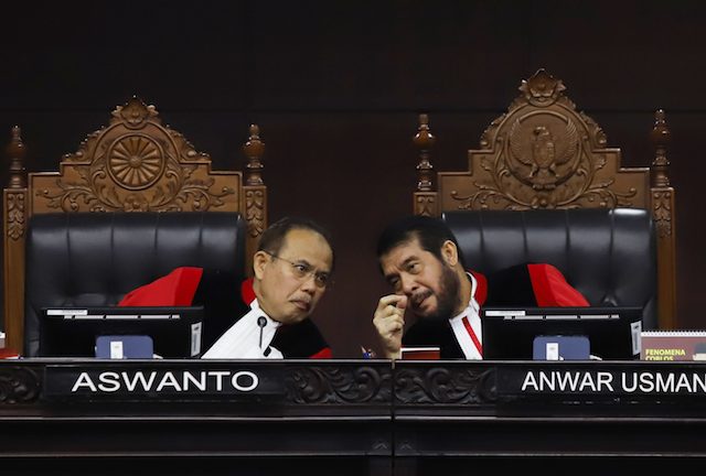 Dua Hakim Mahkamah Konstitusi tampak sedang berdiskusi dalam jalannya sidang Perselisihan Hasil Pemilihan Umum (PHPU) Pilpres 2019. Foto: Dery/JawaPos.com