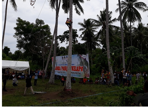 PANJAT POHON KELAPA – Peserta saat memanjat pohon kelapa pada lomba panjat pohon kelapa di Desa Bamabalemo Kecamatan Parigi. Selasa (27/8/2019). Foto : ASWADIN/PE