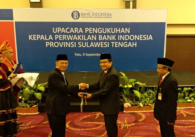 PALU EKSPRES, PALU– Setelah serahterima jabatan pada 17 Juli 2019, Pejabat Kepala Kantor Perwakilan (Kpw) Bank Indonesia (BI) Provinsi Sulawesi Tengah resmi dikukuhkan, Senin 9 September 2019.