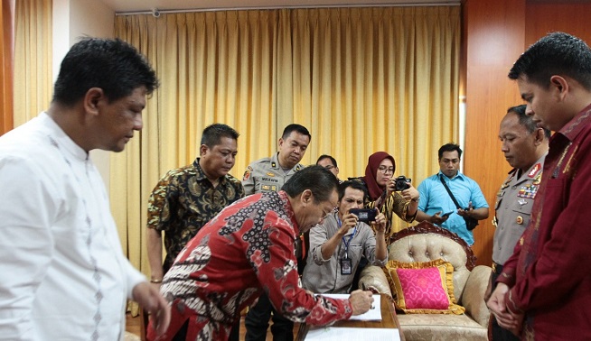 Penandatangan Naskah Perjanjian Hibah Daerah Propinsi Sulawesi Tengah dengan Bawaslu Propinsi Sulawesi Tengah dilaksanakan Gubernur Sulawesi Tengah bersama Ruslan Husen serta Naskah Perjanjian Hibah Daerah Pemerintah Propinsi Sulawesi Tengah dengan Kepolisian Daerah Propinsi Sulawesi Tengah Bersama Kapolda Sulawesi Tengah yang diwakili Wakapolda Brigjen Pol. Nurwindiyanto, dilakukan di ruang Kerja Gubernur, Jumat 21 November 2019.