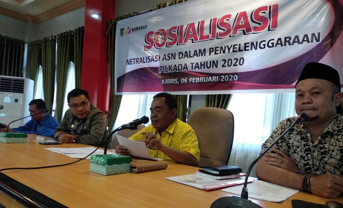 Ketua Bawaslu, Ivan Yudartha, Sekkot Palu H Asri, Asisten I Rifani Pakamundi dan Asisten III, Imran M Lataha dalam sosialisasi tahapan dan netralitas ASN, Kamis 6 Februari 2020 di Ruang Bantaya Kantor Wali Kota Palu. Foto: Hamdi Anwar/PE