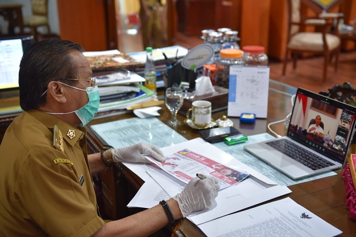 Gubernur Longki mengikuti rapat melalui video conference tersebut di ruang kerja gubernur didampingi Kepala BPBD Sulteng Bartholomeus Tandigala, Kadis Kesehatan dr. Renny Lamadjido, Kadis Pendidikan Irwan Lahatje. Kadis Perhubungan dan Kepala Biro Humas dan Protokol.