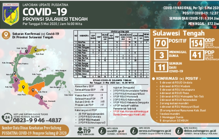 PALU EKSPRES, PALU– Laporan update Pusdatina Sulawesi Tengah pada Rabu (6/5) pukul 16.00 WITA mencatat 70 kasus terkonfirmasi positif.
