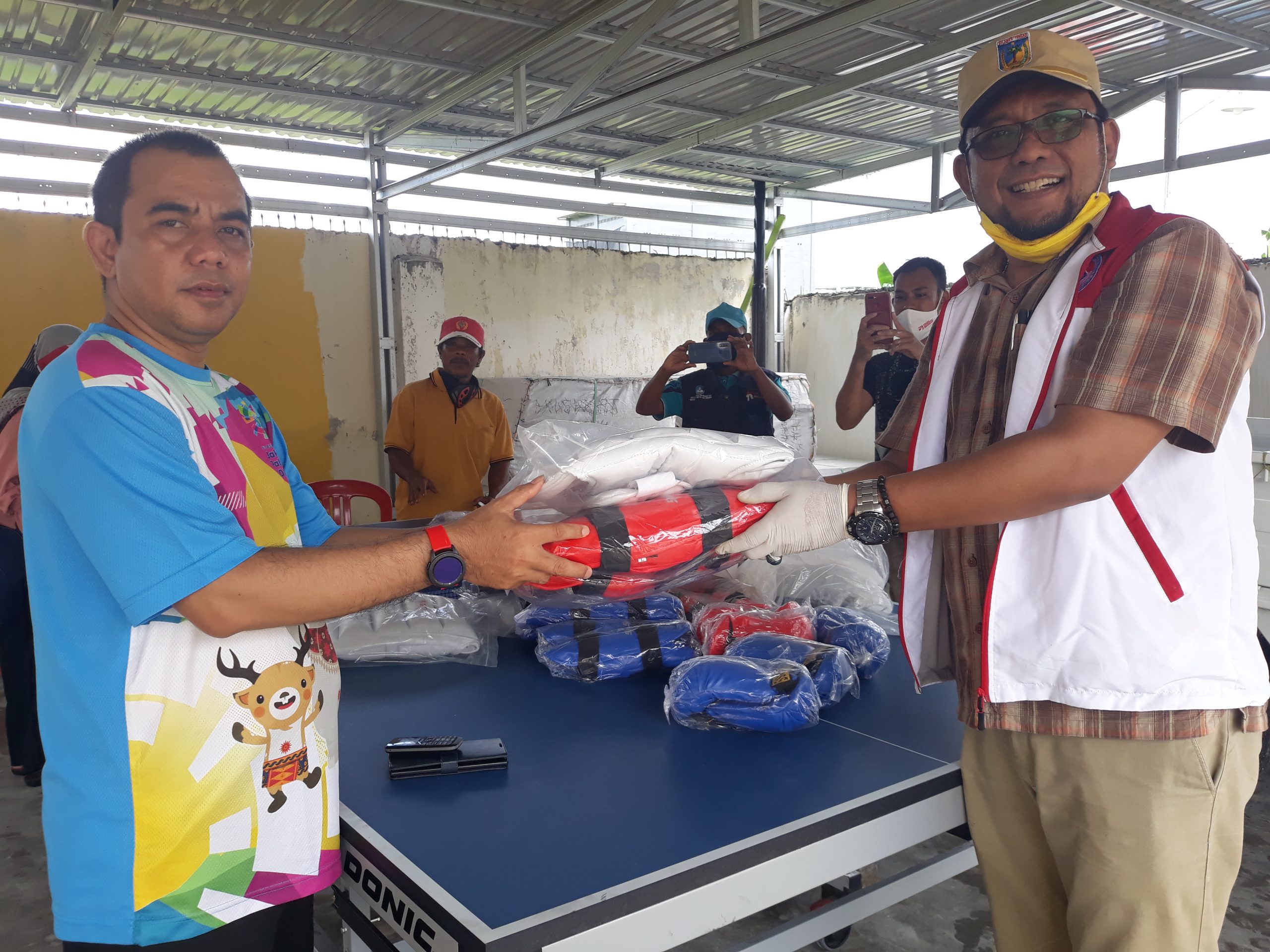 Kepala Seksi Sapras Dinas Pemuda Olahraga Provinsi Sulteng, Dudi Gunawan Iswanto menyerahkan bantuan sarana olahraga secara simbolis kepada Ketua Lemkari Parimo, Faisan. Foto : ASWADIN/PE