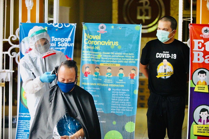 Satu persatu dokter yang selama ini turun di garda terdepan melawan penyebaran Covid-19, di cukur agar terlihat lebih rapi. Maklum saja, selama dua bulan rambut para dokter sudah memanjang karena tidak pernah dipotong.