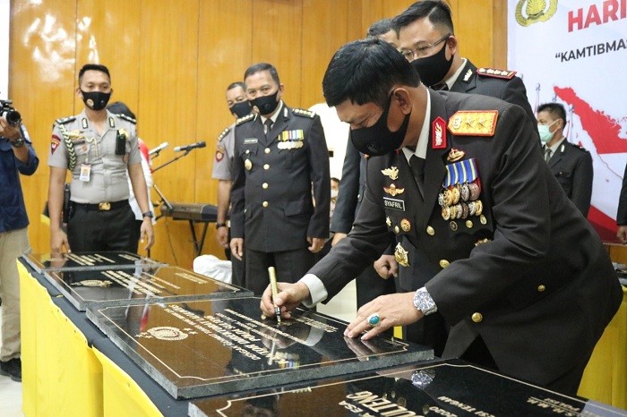Kapolda Sulteng Irjen Pol. Syafril Nursal menandatangani prasasti 8 proyek Polri di lingkungan Polda Sulawesi Tengah hari ini, Rabu (1/7/2020), dalam acara syukuran hari Bhayangkara ke-74 di Aula Torabelo Polda Sulteng. Foto: Humas Polda Sulteng