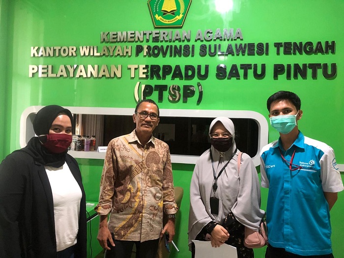 Ketua Satgas Layanan Sertifikasi Halal Kemenag Sulteng, H. Sofyan Arsyad berfoto bersama salah satu pelaku IKM/UMKM binaan PT. Telkom untuk pendaftaran dan pengambilan formulir sertifikasi halal produk usaha binaan. Foto: Istimewa