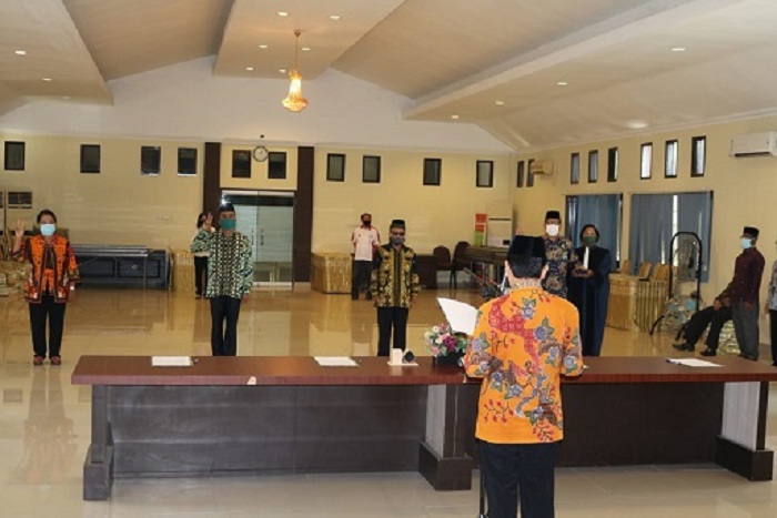 PALU EKSPRES, PALU– Kepala Kantor Wilayah (Kakanwil) Kementerian Agama (Kemenag) Sulteng Rusman Langke melantik pejabat pengawas (Eselon IV) lingkup Bidang Bimas Kristen di Aula Kanwil Kemenag Sulteng, Rabu (29/7/2020). Pelantikan tersebut menerapkan protokol kesehatan.