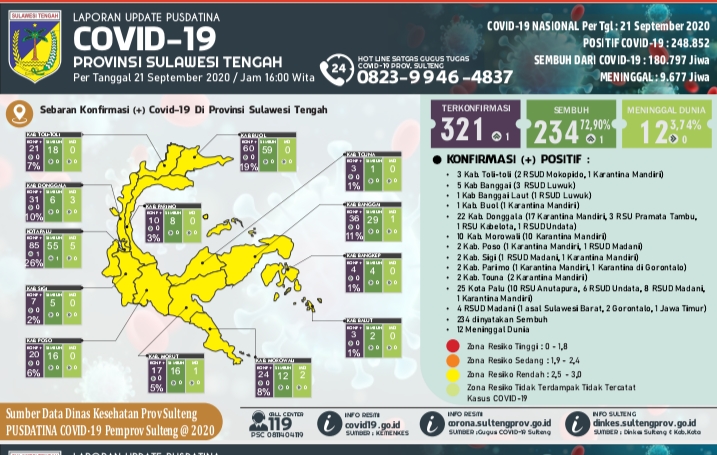 PALU EKSPRES, PALU – Jumlah kasus terkonfirmasi positif Covid-19 di Sulteng pada Senin (21/9/2020) yang menjalani perawatan tak bertambah. Walau terjadi penambahan kasus terkonfirmasi positif COVID-19 sebanyak satu orang di Kota Palu, namun juga terjadi seorang pasien dinyatakan sembuh di Kota Palu.