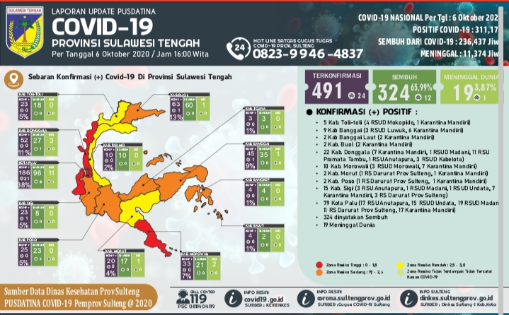 Sementara total yang sembuh di Sulawesi Tengah 324 orang dan yang meninggal dunia akibat Covid-19 sebanyak 19 orang.