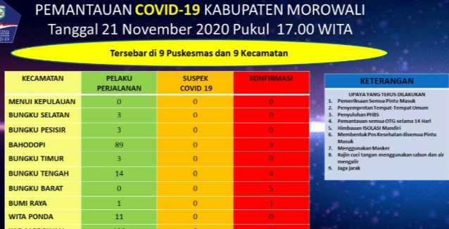 Data Gugus Tugas Covid-19 Morowali mencamtukan warga terkonfimasi positif Covid-19 di kabupaten itu, sebanyak 3 orang berasal dari Kecamatan Bahodopi, 4 orang dari Bungku Tengah, 5 orang dari Bungku Barat, dan seorang lagi dari Kecamatan Bumi Raya.