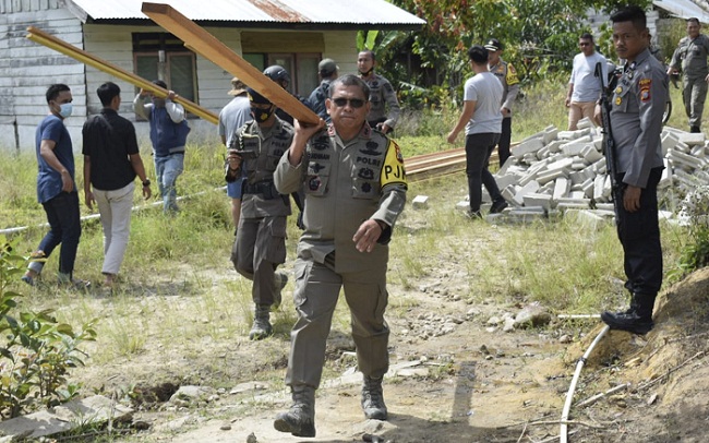 Tampak perwira tinggi bintang dua di Polda Sulteng itu tidak canggung untuk mengangkat balok kayu dan bersama anggota bergotong royong secara estafet memindahkan material bangunan.
