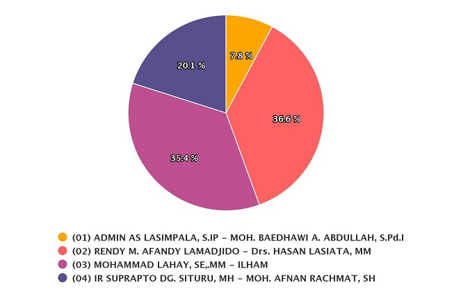 Hingga Minggu (13/12/2020) pukul 08.52:56 WITA, selisih perolehan suara kedua paslon 704 suara. Paslon Rendy- Hasan memperoleh 21.940 suara atau 36,6 persen, sedangkan Paslon Muhamad Lahay- Ilham memperoleh 21.236 suara atau 35,4 persen.