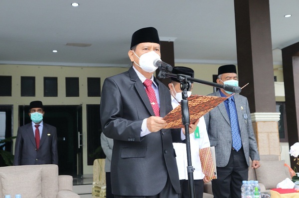 Kakanwil Kemenag Provinsi Sulteng Rusman Langke membacakan sambutan tertulis Menag RI Yaqut Colil Qoumas pada upacara peringatan Hari Amal Bakti Kementerian Agama ke 75, Selasa (5/1/2021), di halaman Kanwil Kemenag Sulteng. Foto: Humas Kemenag Sulteng