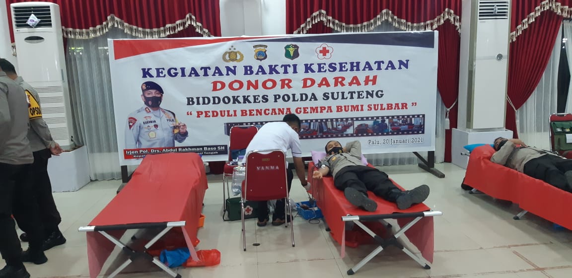 “Biddokkes Polda Sulteng bekerjasama dengan Palang Merah Indonesia Sulteng, pagi ini menggelar bhakti kesehatan donor darah peduli bencana gempa bumi Sulbar,” kata Kabidhumas Polda Sulteng melalui rilis yang diterima media ini, Rabu (20/1/2021).