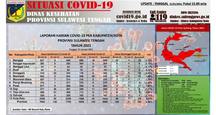 Merujuk tambahan pasien yang sembuh, total kasus aktif Covid-19 Sulteng mencapai 2549 pasien. Adapun untuk kasus meninggal dunia tercatat totalnya sudah 184 kasus setelah ada tambahan 1 kasus meninggal hari ini. (***/bid/palu ekspres)