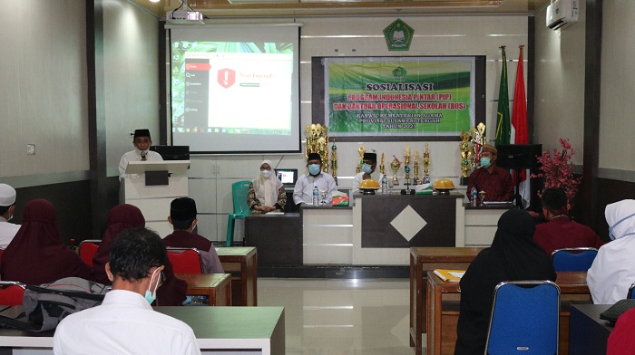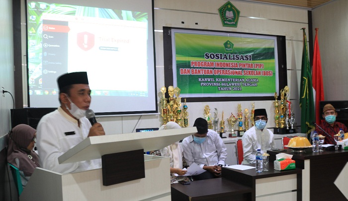 PALU EKSPRES, PALU – Kementerian Agama (Kemenag) Provinsi Sulawesi Tengah melalui Bidang Pendidikan Agama dan Keagamaan Islam mensosialisasikan Program Indonesia Pintar (PIP) dan Bantuan Operasional Sekolah (BOS) di Aula Kemenag Poso, Rabu (10/2/2021).