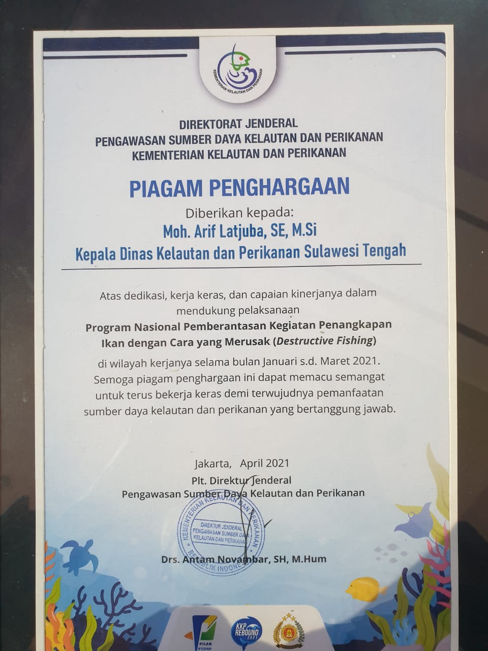Dan, pada hari ini, Rabu (7/4/2021), penghargaan tersebut diserahkan langsung oleh Sekjen KKP Antam Novambar kepada Kepala DKP Sulteng, Arif Latjuba atas dedikasi, keras keras, capaian kinerjanya dalam mendukung pelaksanaan Program Nasional Pemberantasan Kegiatan Penangkapan Ikan dengan Cara yang Merusak (Destructive Fishing) di wilayah kerjanya selam bulan Januari hingga Maret 2021.