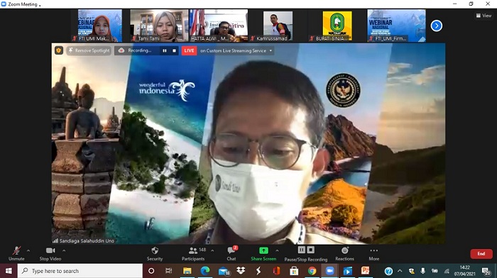 PALU EKSPRES, BULUKUMBA– Webinar Nasional dengan topik Bangkitkan Ekonomi melalui Pariwisata dan Ekonomi Kreatif Sulawesi Selatan, Rabu, 7 April 2021 terlaksana dengan sukses. Hadir Menteri Pariwisata dan Ekonomi Kreatif RI Sandiaga S. Uno, Bupati Kabupaten Sinjai A. Seto Asapa, Plt Sekda Kabupaten Bulukumba Misbawati A.Wawo, Ketua Masyarakat Sadar Wisata Provinsi Sulsel Dr Hatta Alwi Hamu, Ketua HIPMI Sulsel Andi Rahmat Manggabarani, serta pelaku ekonomi kreatif, Tumming dan Abu.