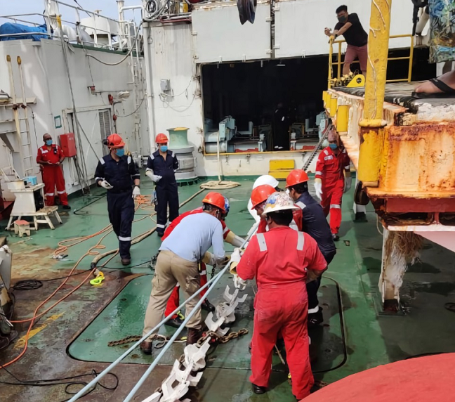 Tim Teknisi sedang melakukan penarikan kabel fiber optic laut SMPCS sisi ruas arah Sorong di atas Kapal DNEX Pacific Link (DPL). Foto: Humas Telkom