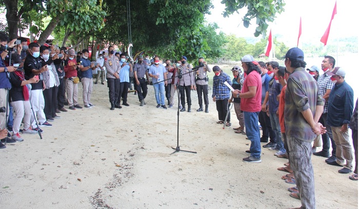 PALUEKSPRES, POSO– 23 mantan narapidana teroris (Napiter) Poso, Sulawesi Tengah (Sulteng), membacakan ikrar setia kepada Negara Kesatuan Republik Indonesia (NKR) di Iyato Beach Kabupaten Poso, Senin (11/10/2021). Acara yang dikemas dalam bentuk ramah tamah bertajuk “Merajut persatuan dalam bingkai NKRI” tersebut digagas oleh Kapolda Sulteng Irjen Polisi Rudy Sufahriadi.