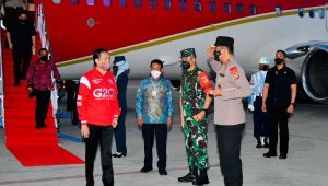 Presiden disambut Gubernur Sulawesi Tengah H Rusdy Mastura, Pangdam XIII/Merdeka Mayjen TNI Alfred Denny Tuejeh, dan Kapolda Sulawesi Tengah Irjen. Pol. Rudy Sufahriadi juga unsur Forkopimda Sulawesi Tengah