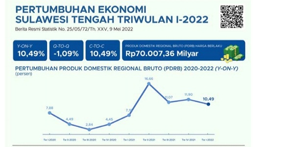 Berdasarkan laporan BPS Sulteng, Ekonomi Sulteng TW I-2022 dibanding TW I -2021 (y-on-y) mengalami pertumbuhan sebesar 10,49 persen.