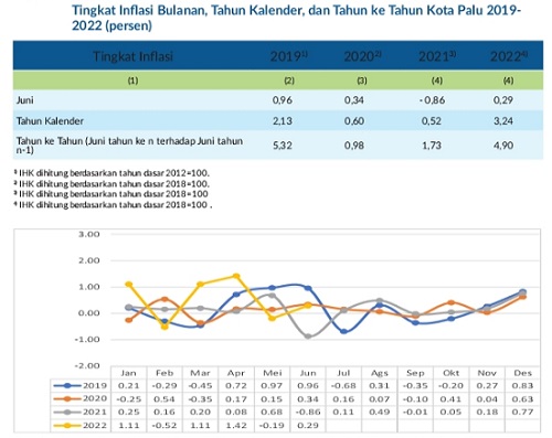 Berdasarkan catatan yang diperoleh redaksi dari BPS Kota Palu, laju inflasi bulan Juni 2022 melampaui laju inflasi pasca-bencana Pasigala pada periode yang sama. Tercatat, laju inflasi pasca-bencana Pasigala pada periode Juni 2019 sebesar 2,13 persen. Selanjutnya, laju inflasi bulan Juni 2020 sebesar 0,60 persen. Dan, bulan Juni 2021 mencapai 0,52 persen.