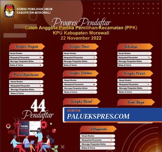 Minat masyarakat di Morowali menjadi anggota Pelaksana Pemilihan Kecamatan (PPK) untuk Pemilu dan Pemilihan serentak 2024, sangat minim. Berdasarkan hasil rekapitulasi yang diterima media ini hingga hari ketiga pendaftaran, dua kecamatan di Morowali, jumlah pendaftarnya baru satu orang, yaitu di Kecamatan Bumi Raya dan Kecamatan Witaponda.