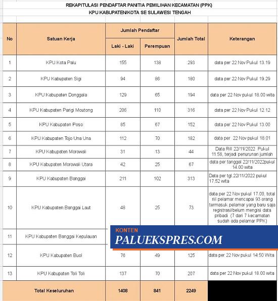 Sebelumnya, hari kedua pendaftaran PPK di Sulawesi Tengah (Sulteng), Senin (21/11/2022), tercatat jumlah pendaftar melonjak tajam dibanding hari pertama pendaftaran. Hampir setiap daerah mengalami peningkatan jumlah pendaftar, kecuali Kabupaten Parigi Moutong (Parimo) yang hanya bertambah 5 pendaftar sehingga terkesan stagnan.