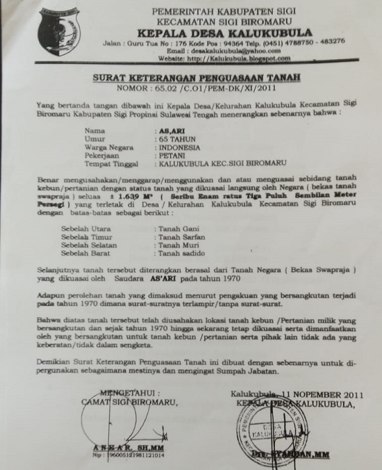 Padahal, SKPT yang dibatalkan oleh Pj Kades Kalukubula, Zakir, S.A.P telah dimiliki oleh As’ari sejak 11 November 2011 berdasarkan SKPT yang ditandatangani Kades Kalukubula, saat itu dijabat oleh Drs Syahban, MM dan diketahui Camat Sigi Biromaru Anhar, SH, MM.