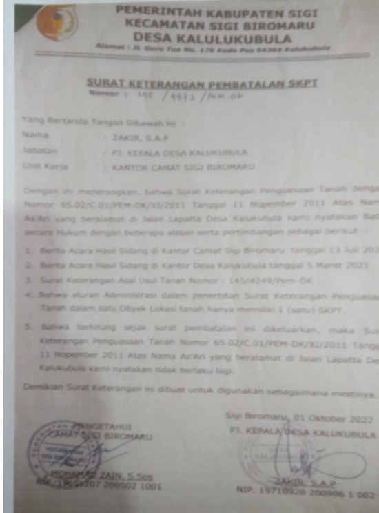 Kelima, Bahwa terhitung sejak surat pembatalan ini dikeluarkan maka surat keterangan penguasaan tanah Nomor 65.02/C.01/PEM-DK/XI/2011Tanggal 11 November 2011 atasnama As’ari dinyatakan tidak berlaku lagi. SK pembatalan tersebut diketahui Camat Sigi Biromaru Mohammad Zain, S.Sos.