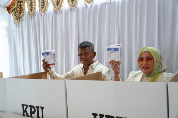 Palu, PaluEkspres.com – Gubernur Sulawesi Tengah Rusdy Mastura bersama Ketua Tim Penggerak Pemberdayaan Kesejahteraan Keluarga (TP-PKK) Provinsi Sulteng Vera Rompas Mastura melakukan pencoblosan surat suara Pemilihan Umum (Pemilu) tahun 2024. Bertempat, di Tempat Pemungutan Suara (TPS) 2, Jl. Lagarutu, Kelurahan Tanamodindi, Kec. Mantikulore, Kota Palu. Rabu, (14/02/2024).