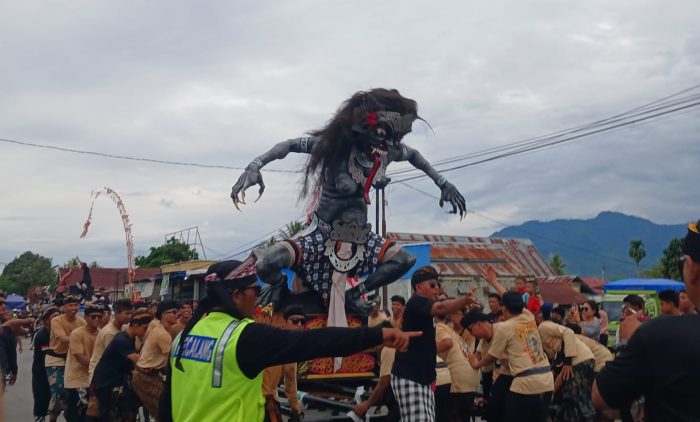 Patung ogoh ogoh, diarak oleh warga perlahan lahan menyusuri ruas jalan trans salawesi menuju Mrajapati Purnasadha desa Tolai untuk dibakar dan dimusnahkan.