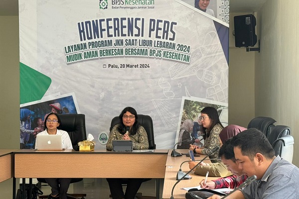 Kepala BPJS Kesehatan Cabang Palu menggelar konferensi pers, Rabu (20/3/2024), soal layanan  JKN selama libur lebaran 2024. Foto: Abidin