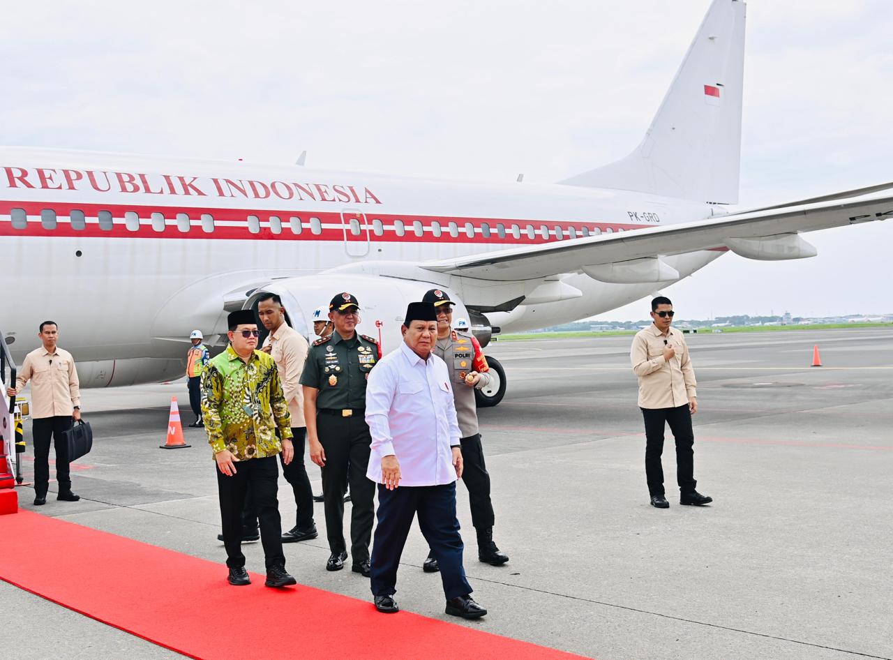 Surabaya, PaluEkspres.com – Presiden Prabowo Subianto tiba di Bandar Udara Internasional Juanda, Kabupaten Sidoarjo, Provinsi Jawa Timur, pada Senin, 10 Februari 2025 sekitar pukul 13.15 WIB, dalam rangka melakukan kunjungan kerja. Ketibaan Presiden di Sidoarjo disambut oleh Pj Gubernur Jawa Timur Adhy Karyono, Pangdam V/Brawijaya Mayjen TNI Rudy Saladin, dan Kapolda Jawa Timur Irjen Pol Imam Sugianto.