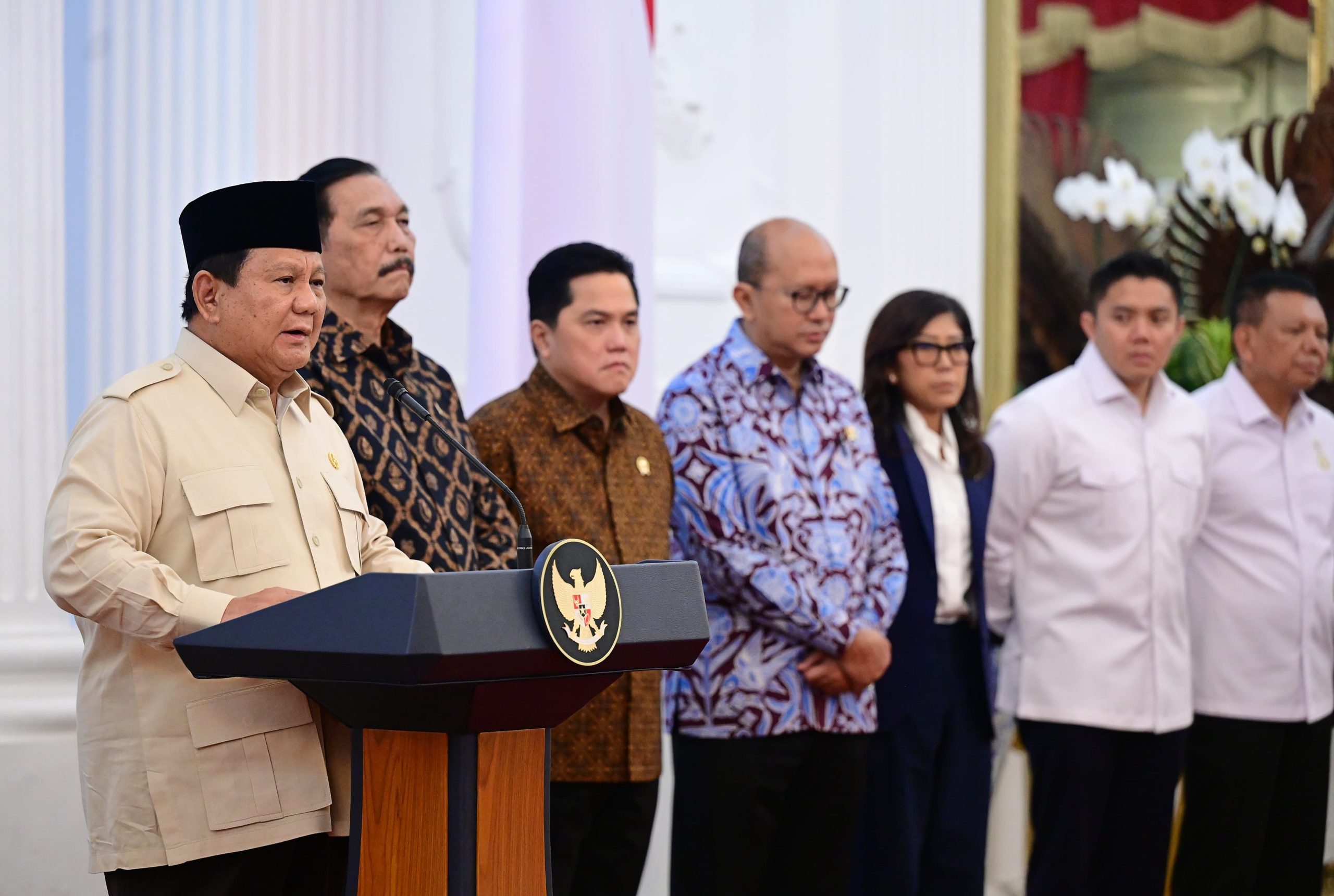 Turut mendampingi Prabowo dalam keterangan pers hari ini yakni Menteri Koordinator Bidang Perekonomian Airlangga Hartato, Menteri Keuangan Sri Mulyani, Menteri Energi dan Sumber Daya Mineral Bahlil Lahadalia, Menteri Sekretariat Negara Prasetyo Hadi, Ketua Dewan Ekonomi Nasional Luhut Binsar Pandjaitan, Menteri Badan Usaha Milik Negara Erick Thohir, Menteri Investasi dan Hilirisasi Roesan P Roeslani, dan Sekretaris Kabinet Teddy Indra Wijaya. ***