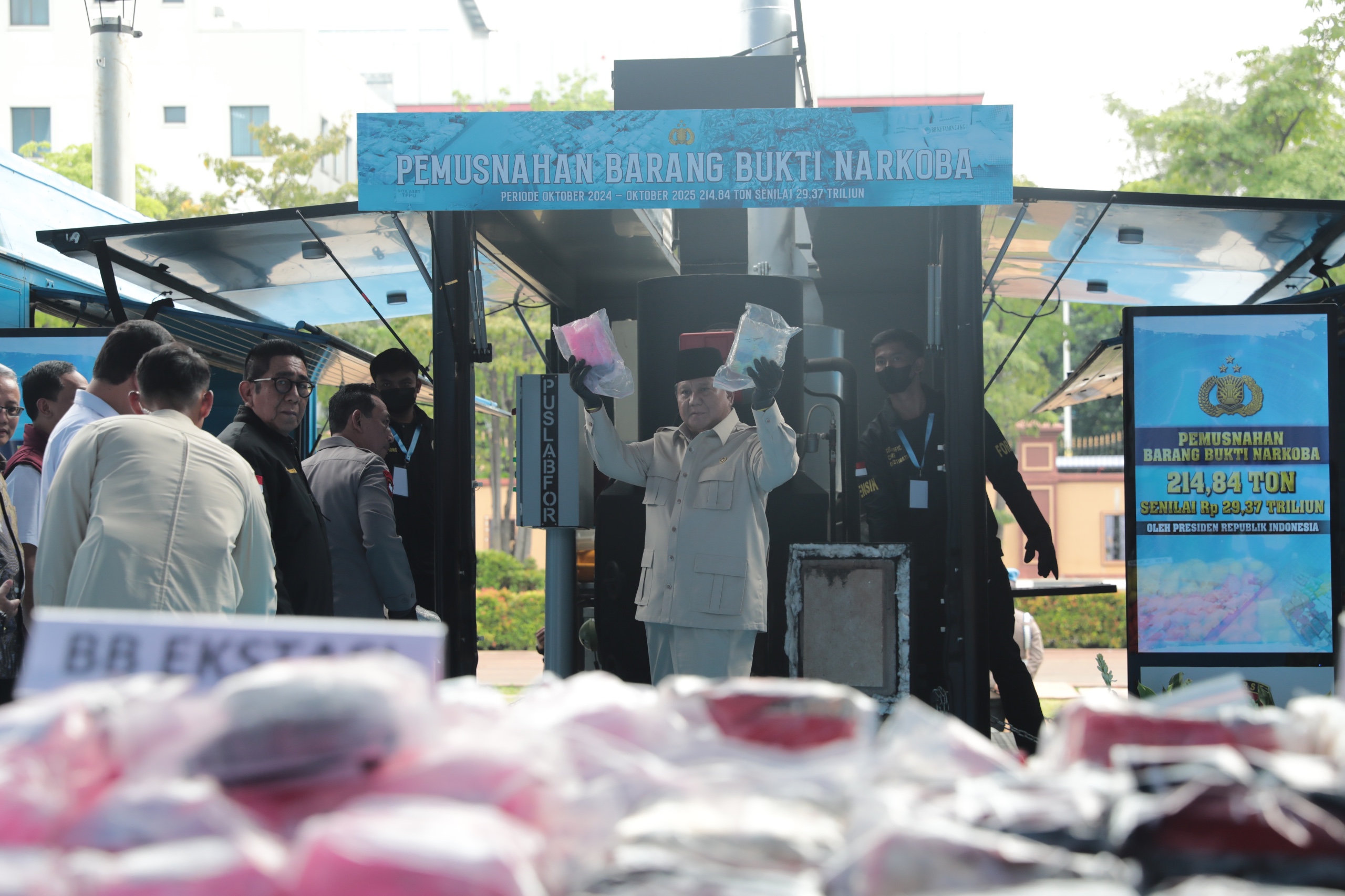 “Saya menyampaikan penghargaan sebesar-besarnya kepada Polri yang telah bekerja keras, sigap, dan konsisten dalam memberantas narkoba. Ini adalah ancaman serius terhadap masa depan bangsa,” kata Prabowo saat memimpin pemusnahan barang bukti narkoba di Lapangan Bhayangkara, Mabes Polri, Trunojoyo, Jakarta, Rabu (29/10).