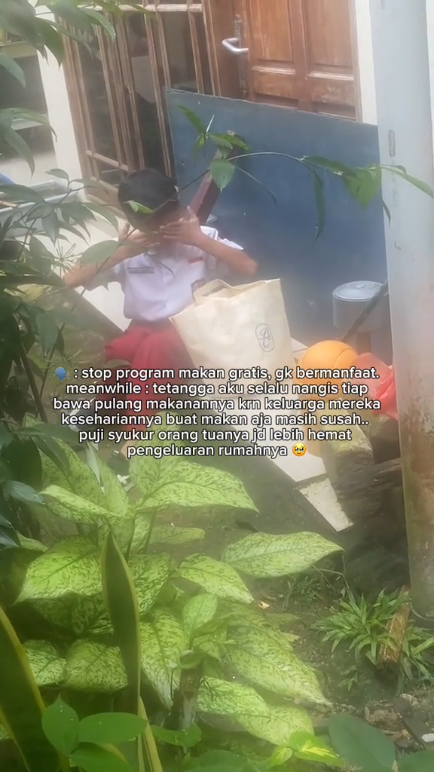 Setibanya di depan rumah, pemandangan yang mengharukan terjadi. Anak itu membuka kantong MBG yang berisi telur, roti, susu, dan buah-buahan. Namun sebelum sempat menyantapnya, ia justru menangis.