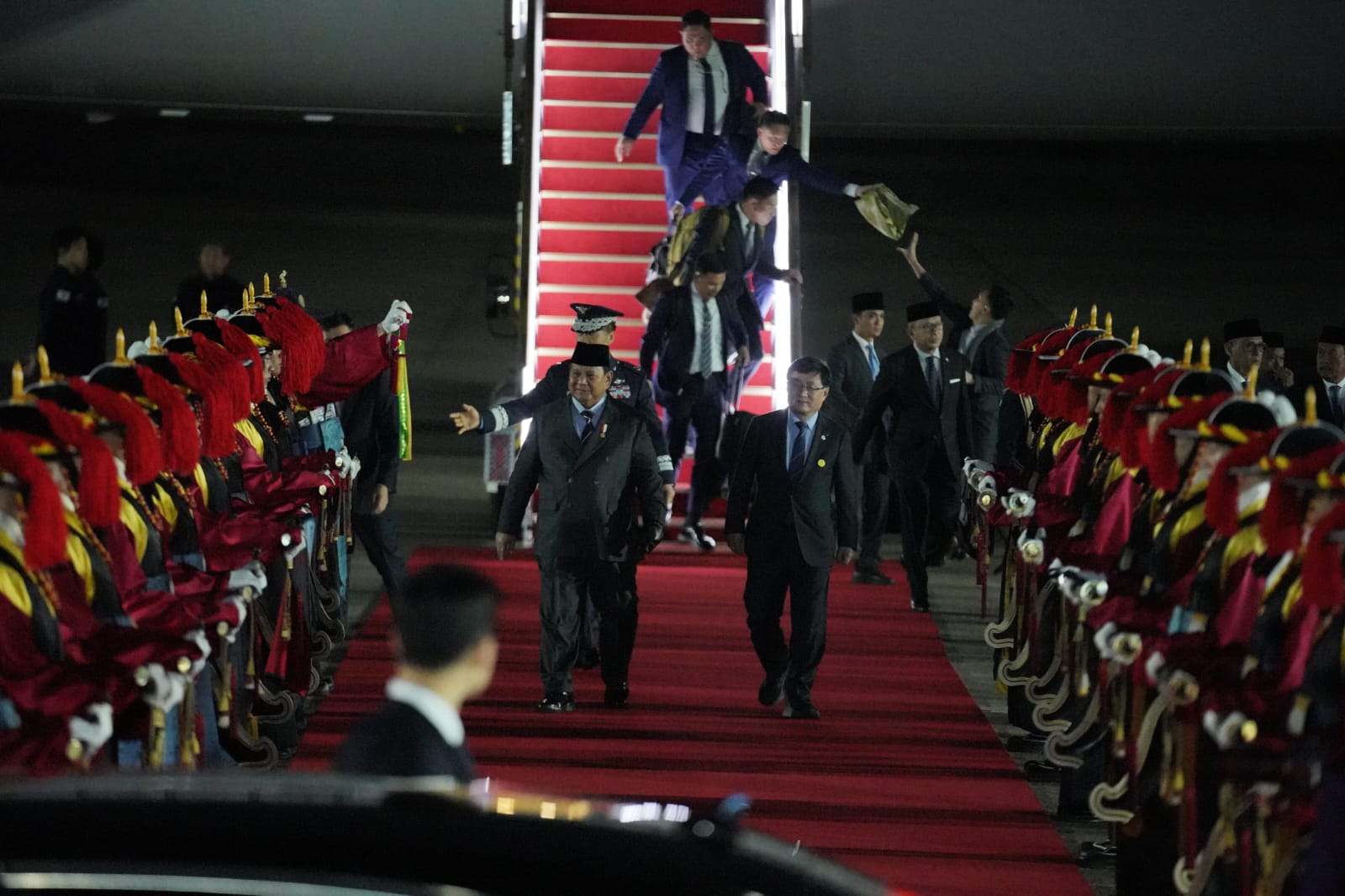 Sementara itu, dari pihak Indonesia, Presiden Prabowo disambut oleh Duta Besar RI untuk Republik Korea, Y.M. Cecep Herawan, serta Atase Pertahanan RI di Seoul, Kol. Pnb. Muhammad Arif.