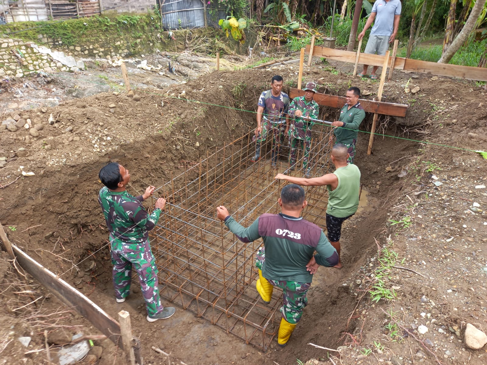 Sejumlah personel terlihat mengeruk tanah di sisi sungai menggunakan ekskavator sebagai titik fondasi utama jembatan. Selanjutnya, mereka pun dibantu warga untuk memasang kerangka besi dan mengecor dengan semen agar struktur lebih kokoh.