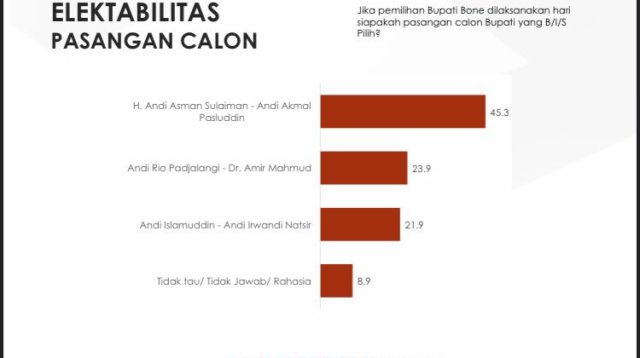 Survei IPI Pilbup Bone: Andi Asman-Andi Akmal 45,3 Persen, Andi Rio-Amir Mahmud 23,9 Persen dan Andi Islamuddin-Andi Irwandil 21,9 Persen