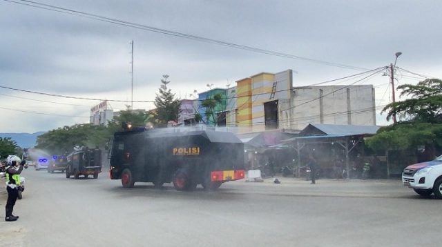 Polres Donggala Lakukan Penyemprotan Disinfektan Pakai Water Canon